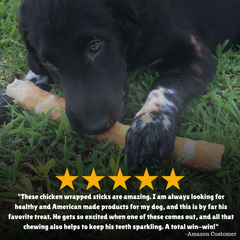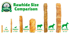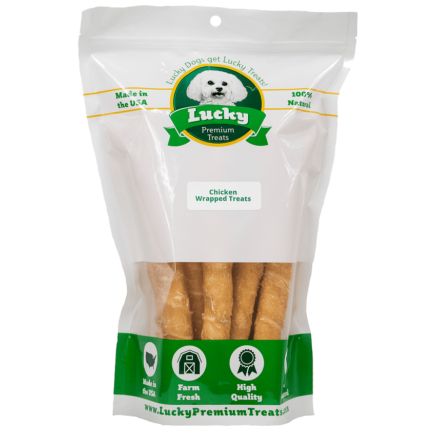 These Lucky Treats are made from just two ingredients: all-natural beefhide and restaurant quality lean chicken breast. Each chew is expertly hand wrapped for the most chicken per bite. This size treats are the perfect size for large dogs like Retrievers, Labradors, German Shepherds, Boxers, and other dogs over 75 lbs